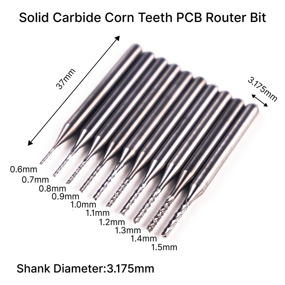 The Corn Bit earns its name from the distinctive geometry of its cutting edge, which resembles the rows of kernels on a corn cob. This design facilitates excellent chip removal, allowing for efficient cutting and drilling tasks.Specifications:Shank Diameter: 3.175mmTotal Length: ~ 38mmMaterial: TiN Coating Solid Carbide